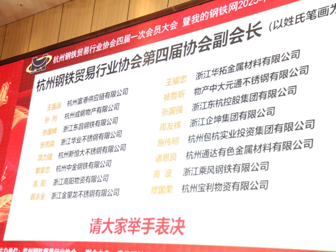 会员大会选举以下16位同志为杭州钢铁贸易行业协会第四届副会长:王国品、王耀忠、孙列、杨哲昕、张国峰、张国强、张宪淼、周友辉、项力建、施传明、郭掌忠、诸恩良、高阳、高波、韩永全、 缪国荣。