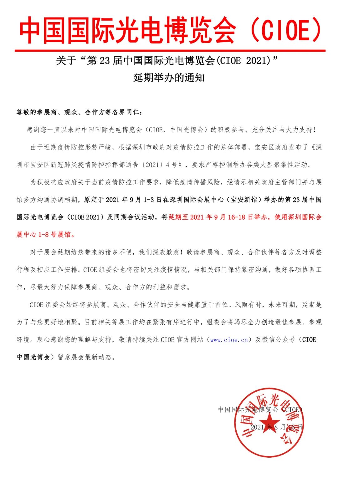 关于“第23届中国国际光电博览会(CIOE 2021)”延期举办的通知