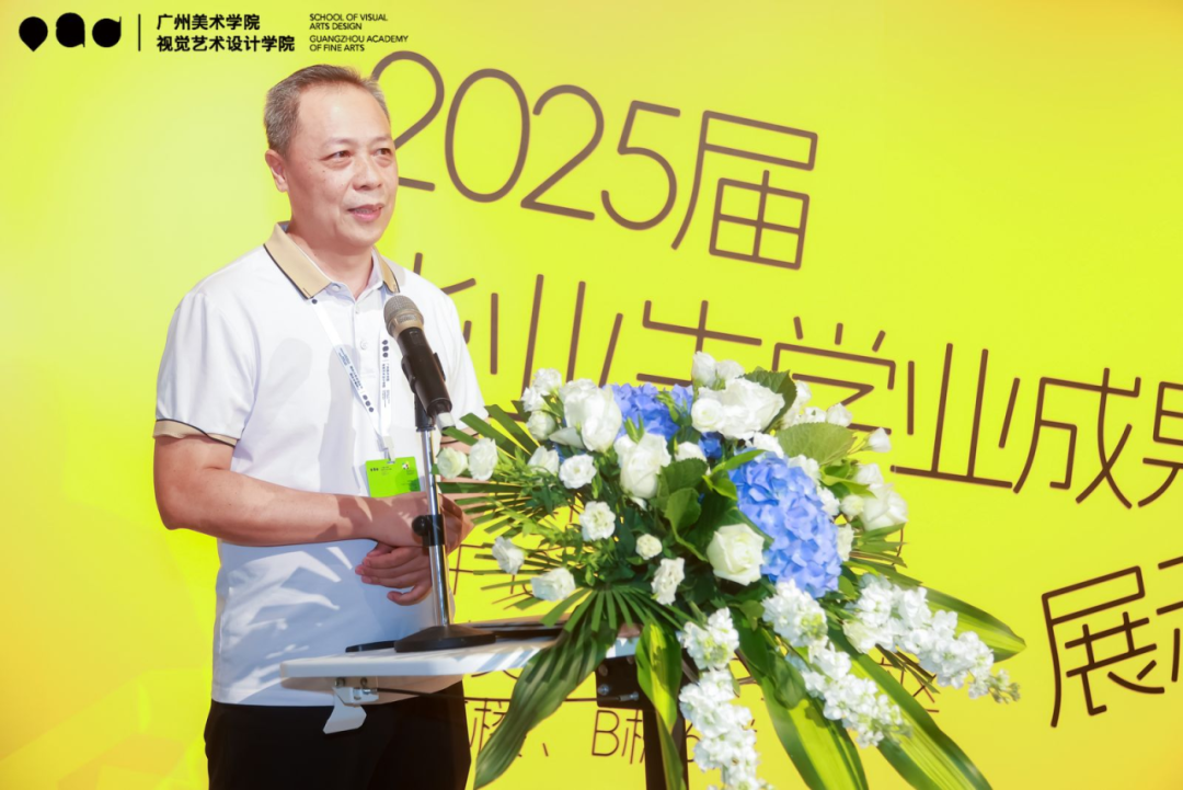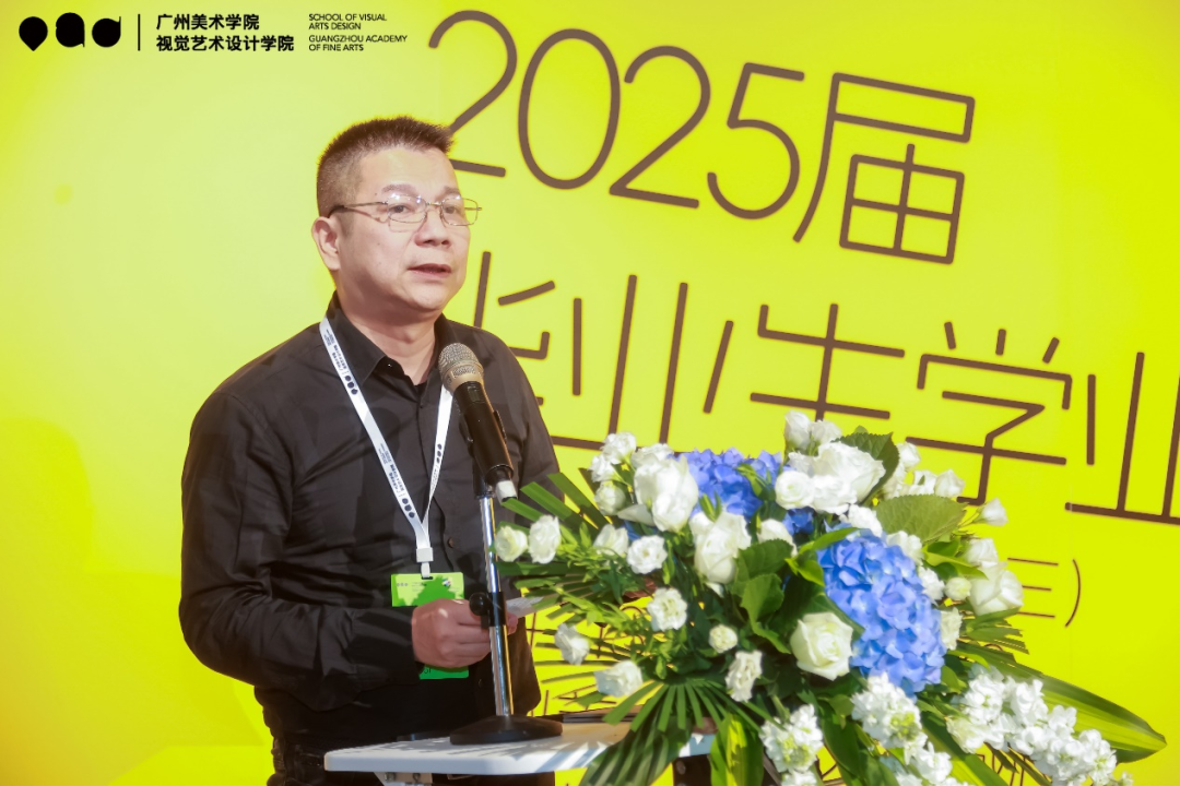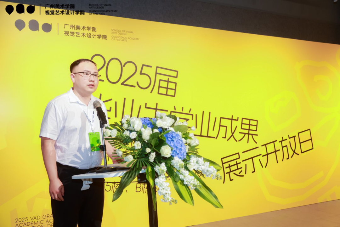 下午2时,活动开幕仪式在大学城A502学院展厅举行,视觉艺术设计学院党总支专职副书记郭亮主持。郭亮对各方来宾表示热烈欢迎,并介绍本次活动共展出视觉艺术设计学院2025届本科毕业生和毕业研究生的699件作品。