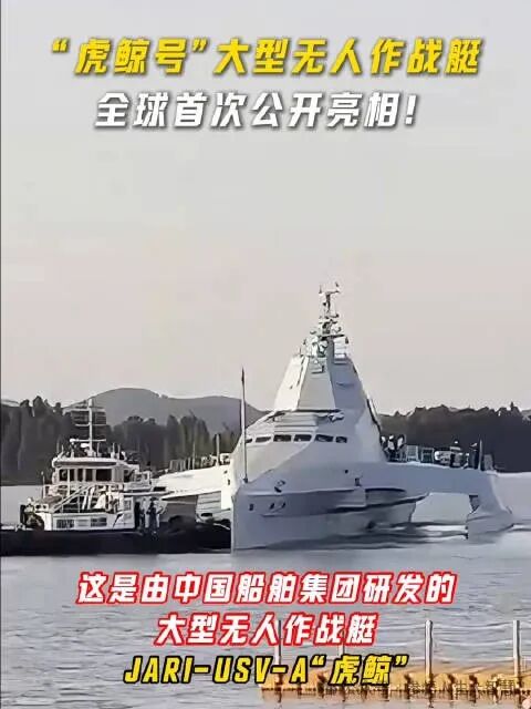 在航展的第二展区,一款名为“虎鲸号”的大型无人作战艇吸引了众多参观者的目光。这款无人作战艇全称为JARI-USV-A,是一型高速隐身的五百吨级水面无人作战装备。其总长58米,型宽23米,最大续航达4000海里,具备超视距火力打击、防空反导及搜潜攻潜等无人自主作战能力。