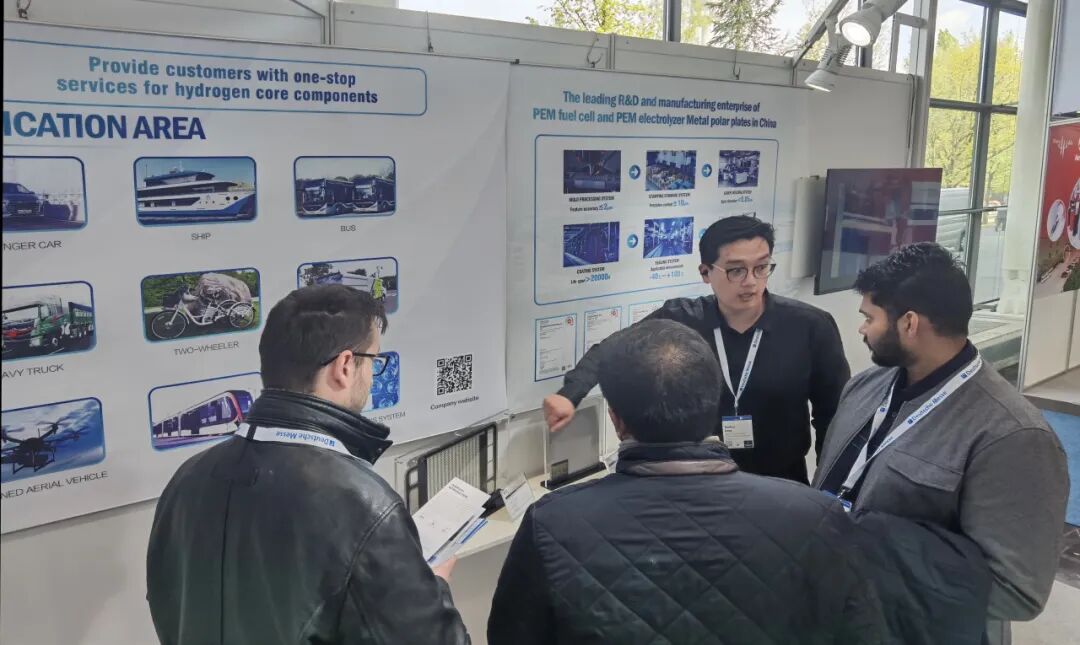 治臻股份展出最大可支持300kW级别电堆的金属双极板产品及技术,采用0.075mm厚度基材,已实现多个项目应用量产。所采用的金属极板涂层已经通过车用工况连续 15000 小时的耐久性测试评估。电解水制氢组件方面,治臻股份展示了第二代PEM电解槽用金属极板-EC1500,受到海内外客户的广泛关注,新一代极板可支撑 组装200 标方PEM电解槽,采用钛合金基材,厚度达到 0.3mm,相比上一代产品减薄 40%,使用寿命超过 4 万小时;同时展示的其他核心组件,与国际先进水平产品同台竞技,获得广泛的关注及认可!治臻股份积极面向全球市场,目前在多个国家地区,达成了一系列合作。借助汉诺威工博会,治臻股份与欧洲多方产业伙伴共议氢能在全球工业化的核心作用,及应对气候变化、实现碳中和的挑战与策略。 展望未来,治臻股份将不遗余力地推动氢能技术的深入研发与广泛应用,积极促进氢能产业在全球范围内的商业化进程,为构建绿色、低碳、可持续的工业体系贡献更多智慧与力量,携手全球伙伴共同迈向一个更加环保、高效的氢能社会!