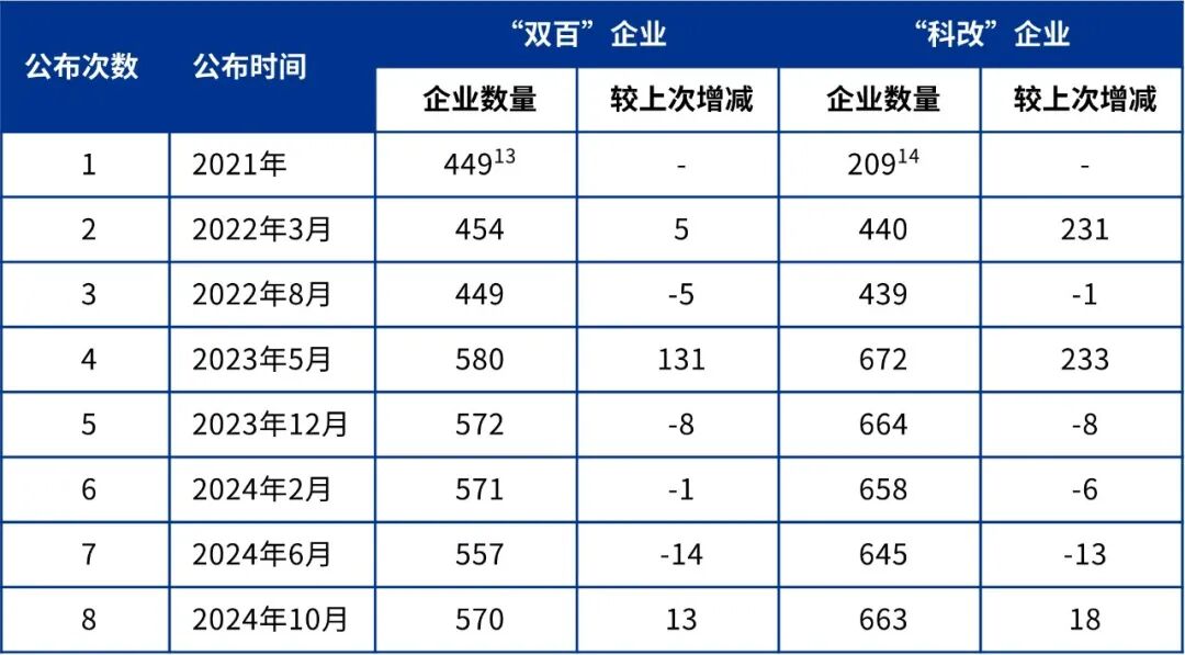 2024年10月,国务院国资委更新了“双百企业”“科改企业”最新企业名单,分别为570家和663家,与2024年6月公布的名单7相比,各净增加13家和18家。这是今年国务院国资委第三次更新两个专项行动入选企业名单(前两次分别为2月和6月),也是2023年12月名单“瘦身”以来,首次纳入试点企业数量实现净增加(历次“双百”“科改”企业数量详见下方附件)。