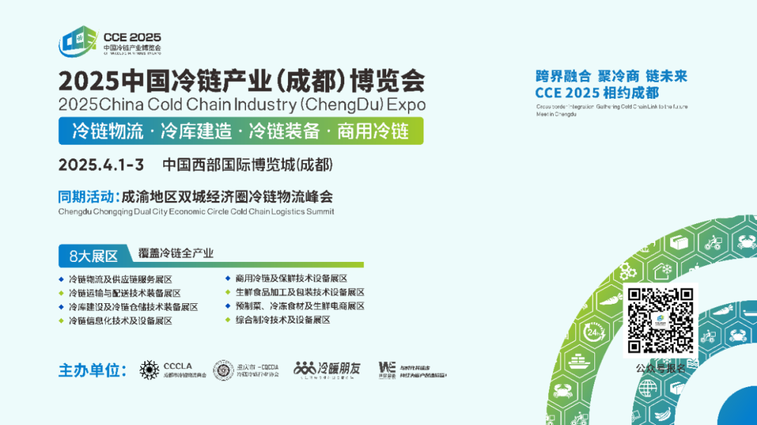 在此行业发展关键期,为加强国内外冷链行业的交流与合作,推进中国冷链行业高质发展。由成都市冷链物流商会、重庆市冷藏冷链行业协会、重庆世展展览有限公司共同主办、冷暖朋友(重庆)会展有限公司承办、众多行业组织及政府支持的“2025 中国冷链产业博览会”将于 4 月 1-3 日在中国西部国际博览城(成都)举行。