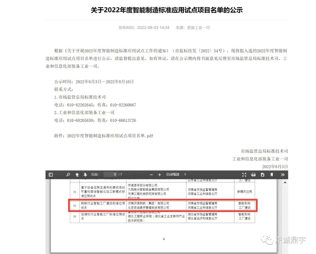 近日,由北京京诚鼎宇管理系统有限公司与河南济源钢铁(集团)有限公司联合申报的《钢铁行业智能工厂建设标准应用试点》入选市场监管总局和工信部2022年度智能制造标准应用试点项目智能车间/工厂建设类名单。