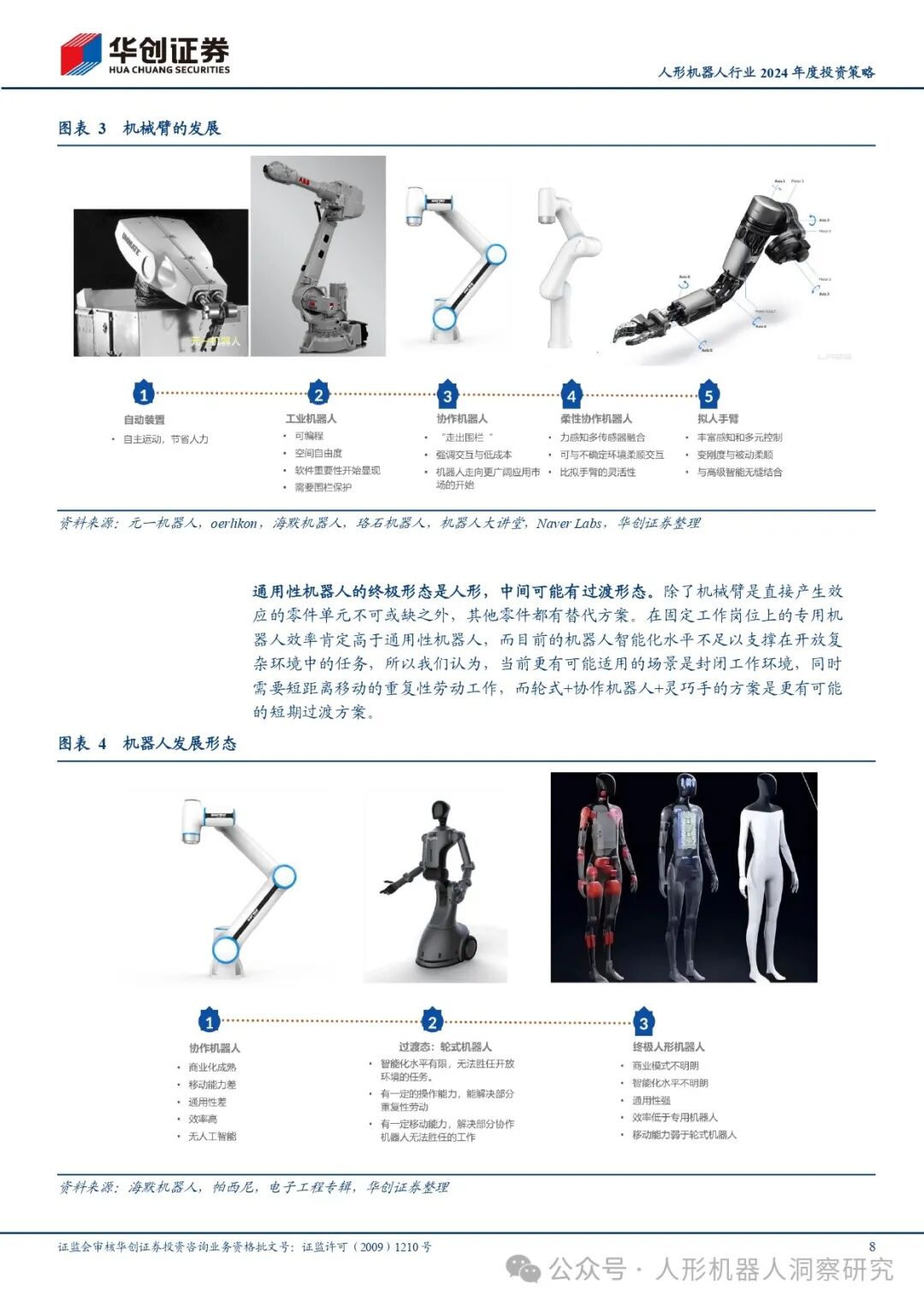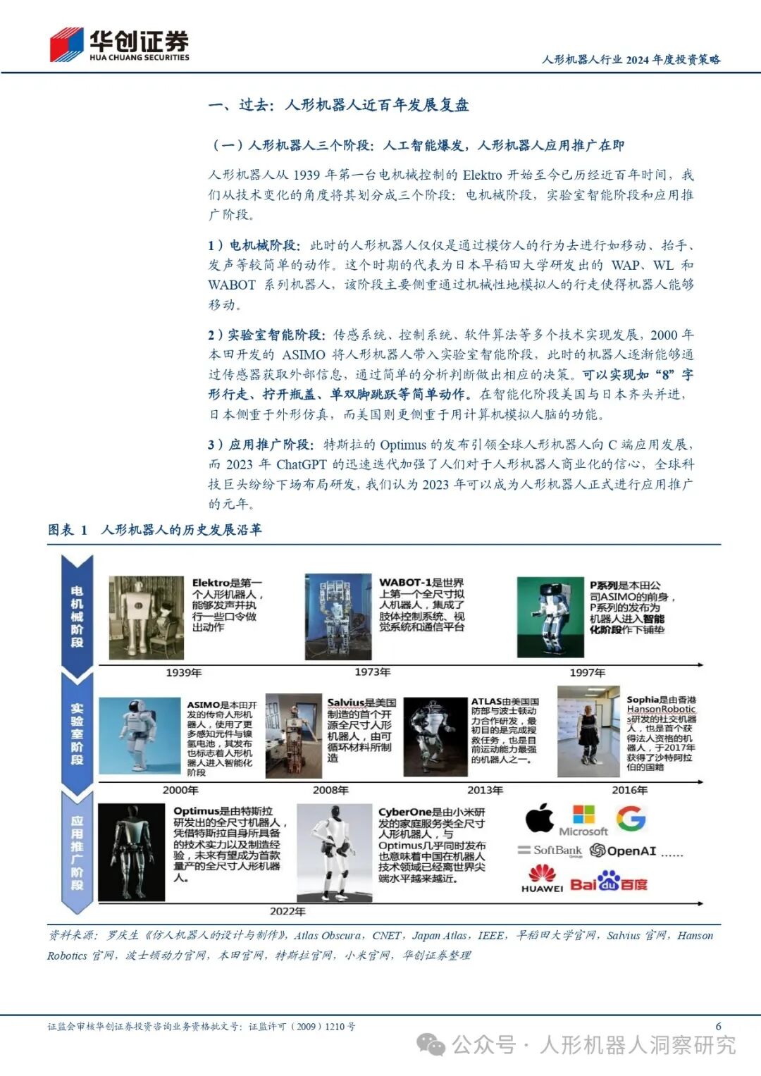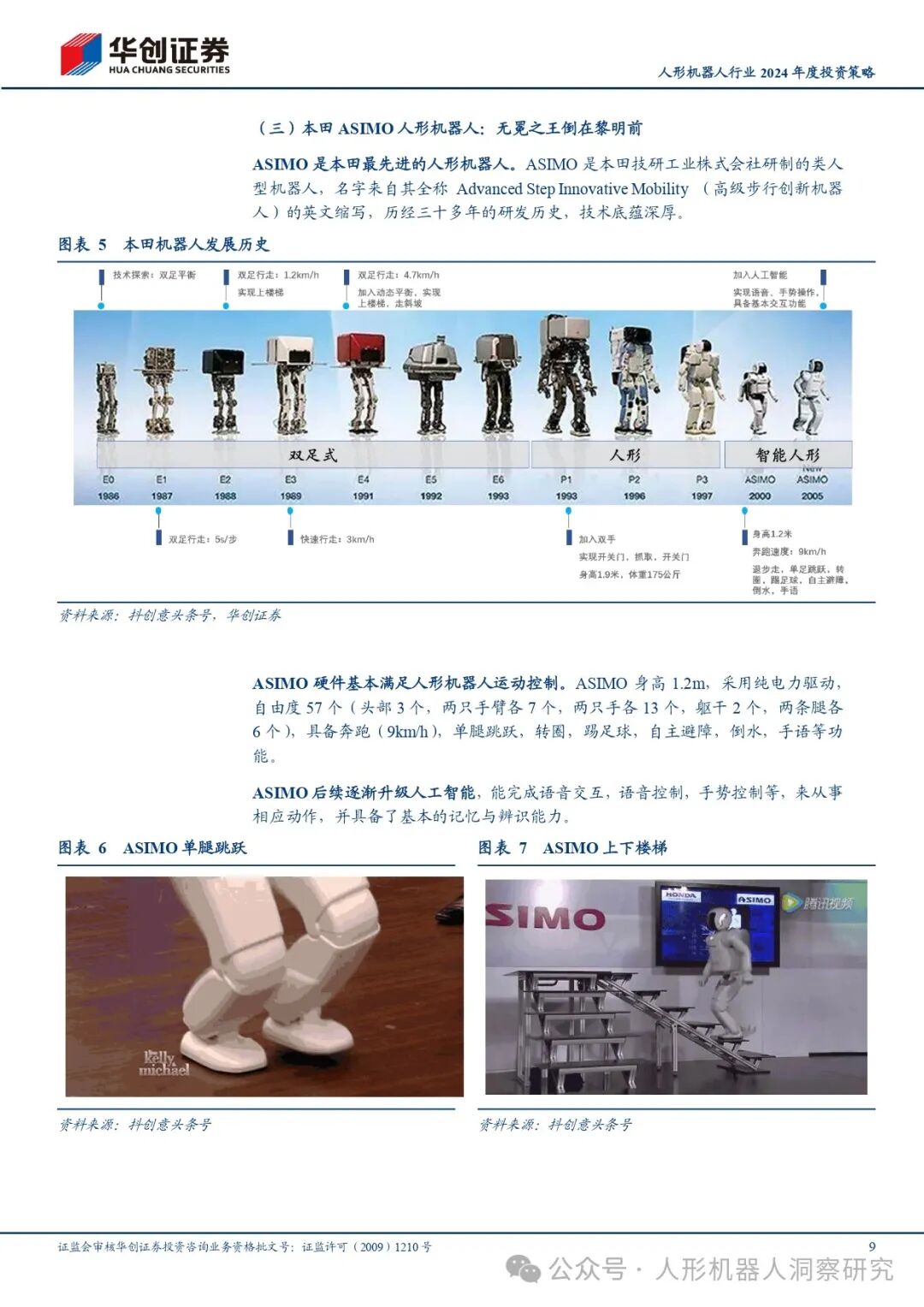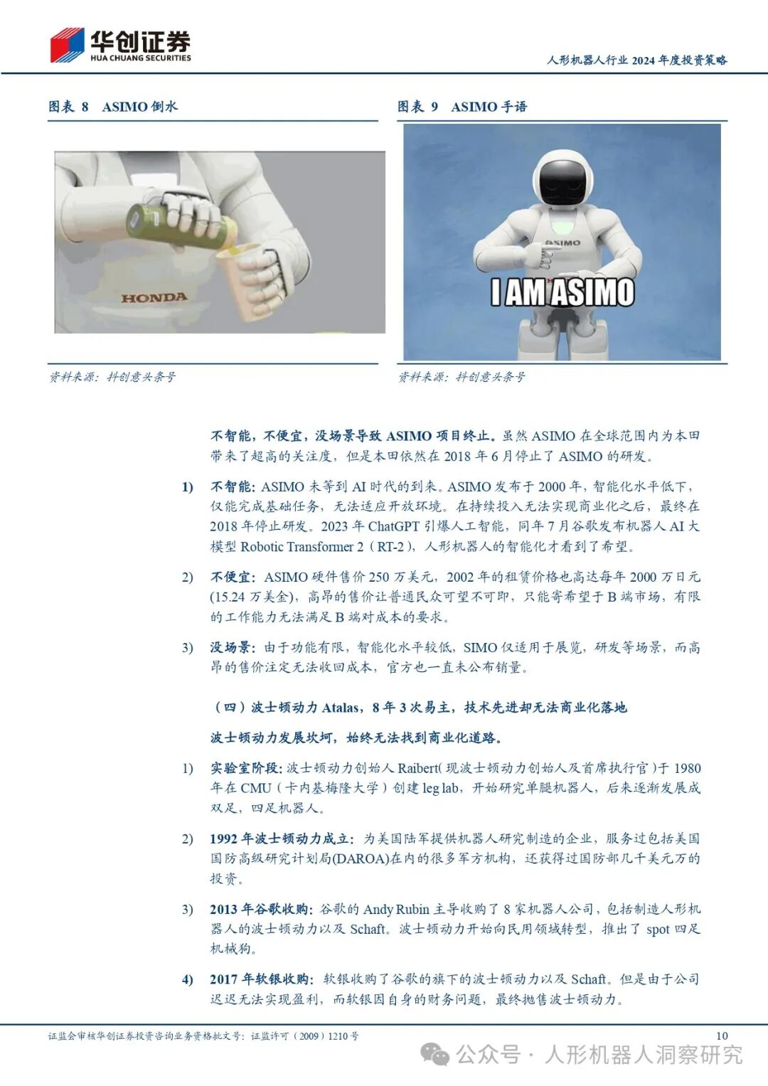 人形机器人正在经历从实验室智能到应用推广阶段,人工智能的爆发成 为关键推手。 人形被认为是通用型机器人的终极形态,我们认为受限于当前智能化水 平及工作场景,可能存在以轮式+机械臂+灵巧手的过渡解决方案。 复盘本田 ASIMO 和波士顿动力的发展历史,本田 ASIMO 从全球瞩目到停止研发,波士顿动力8年3次易主,不智能、不便宜、没场景是其商业化难以落地的关键因素。