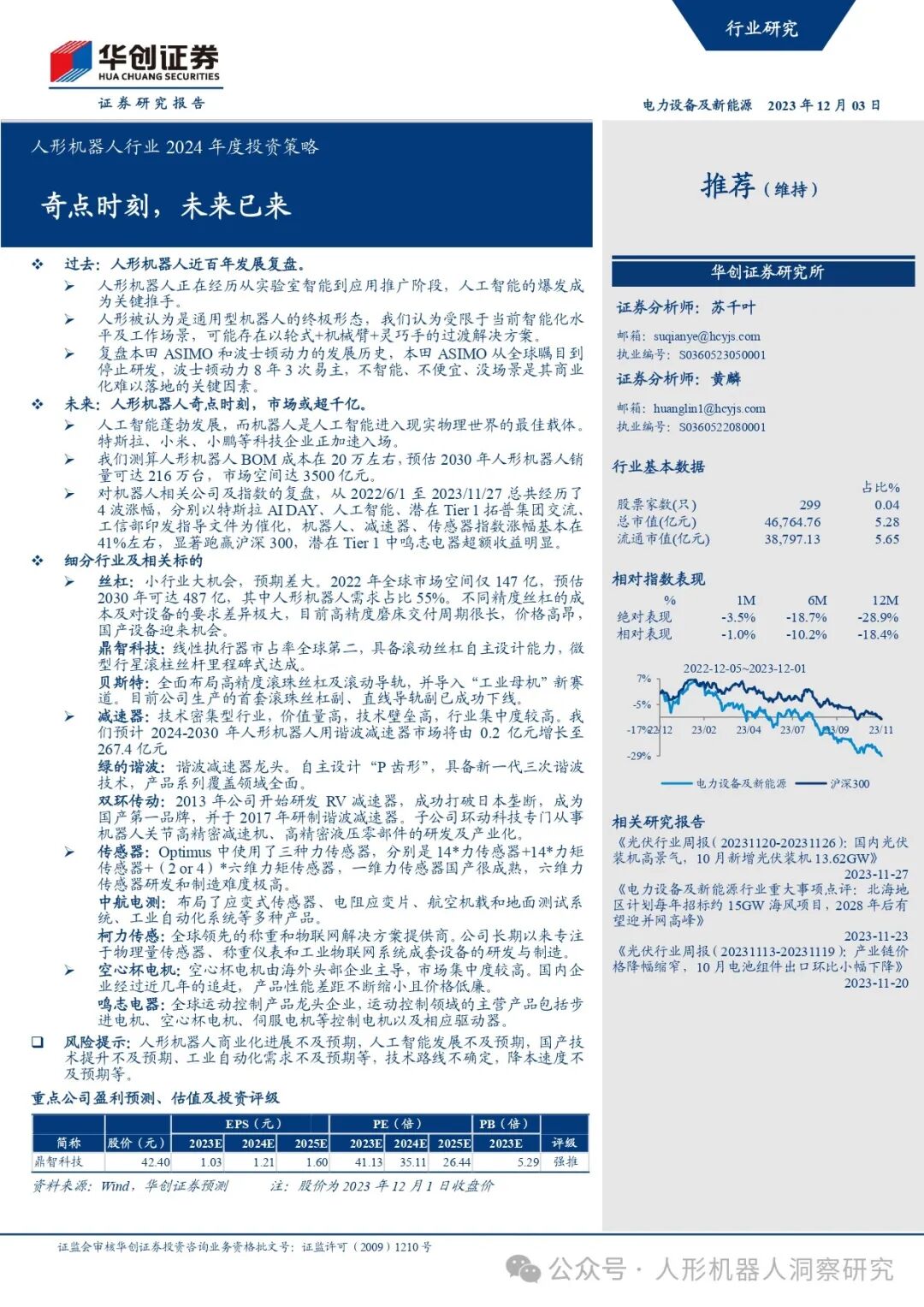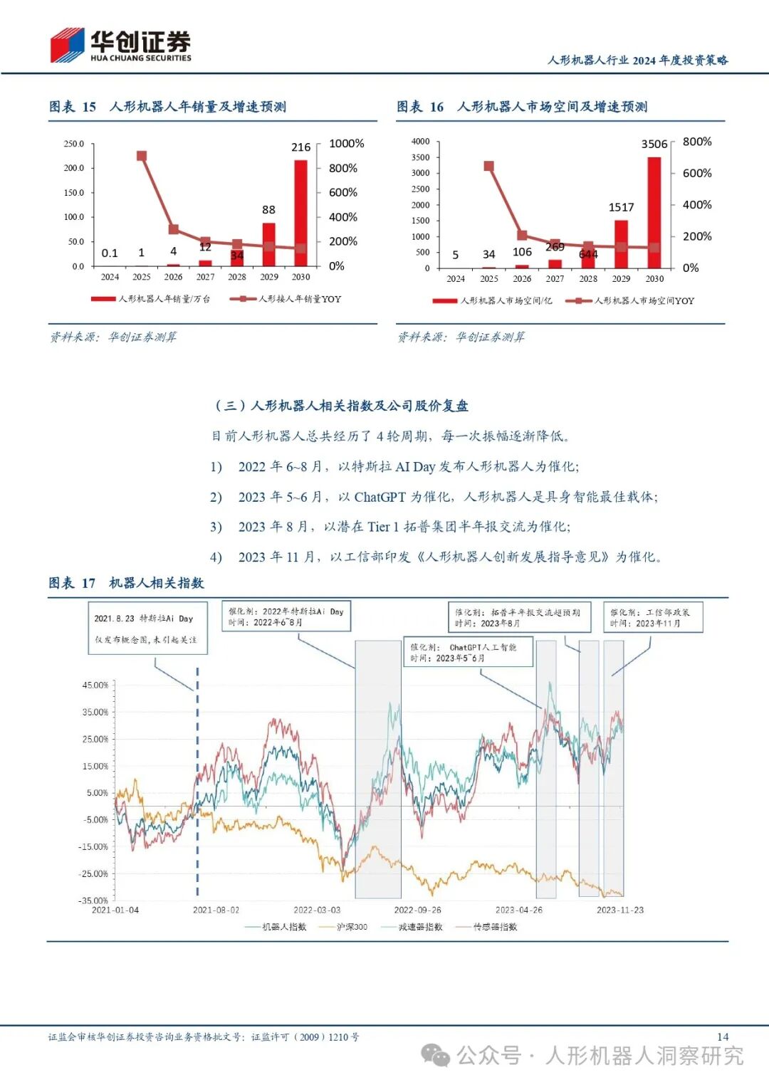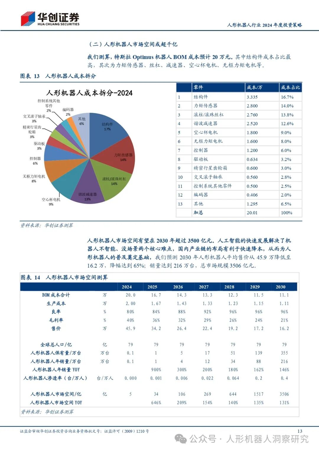 人工智能蓬勃发展,而机器人是人工智能进入现实物理世界的最佳载体。特斯拉、小米、小鹏等科技企业正加速入场。 人形机器人 BOM 成本在 20 万左右,预估 2030 年人形机器人销 量可达 216 万台,市场空间达 3500 亿元。
