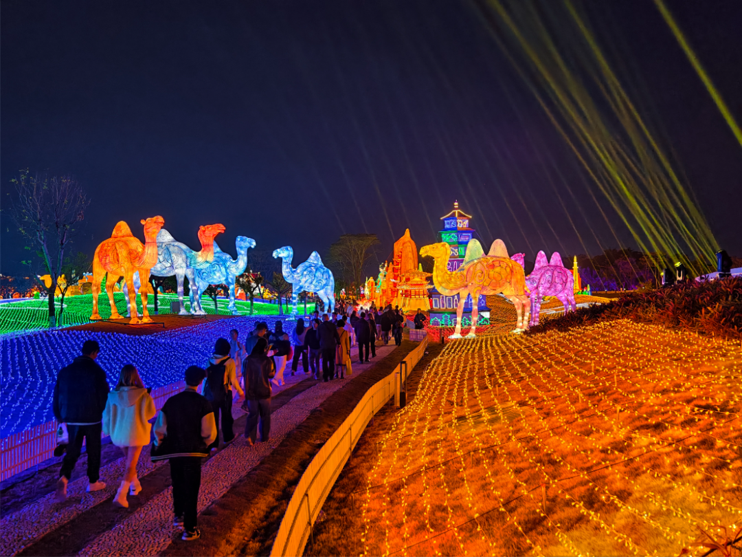 “海上丝路・国际交响”超大型灯组群因大面积的彩灯铺装,成了夜空下最闪亮的片区。整片草地上铺满了各色彩灯,波斯花纹、唐代丝绸纹样、丝绸之路的地标,以及骆驼、金字塔等共建“一带一路”国家的著名人文地标、元素散布其中,让人叹为观止。