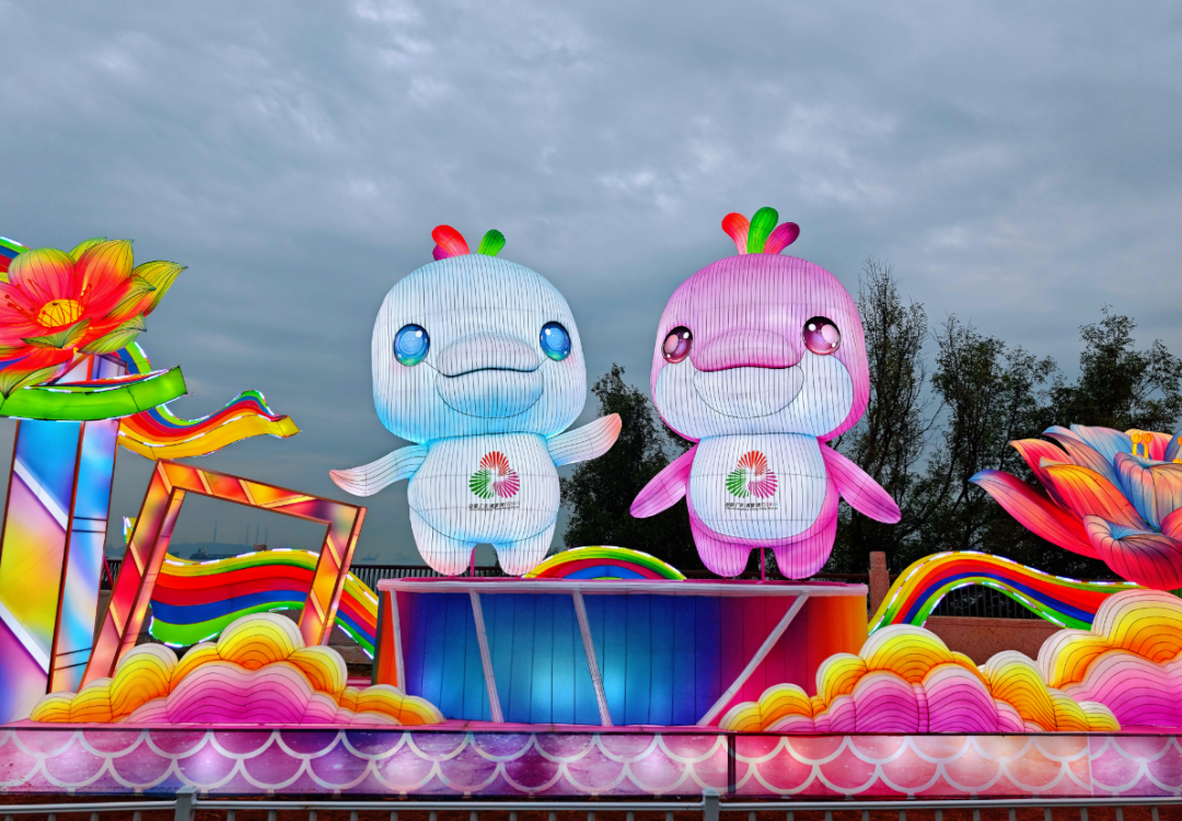长45米、高10米的灯组屹立在海边,融入划船、海豚等运动、海洋元素,“激情全运会,活力大湾区”“追梦大湾区,出彩人生路”等标语点缀其间。十五运会和残特奥会吉祥物“喜洋洋”与“乐融融”首次以彩灯的形式展现。