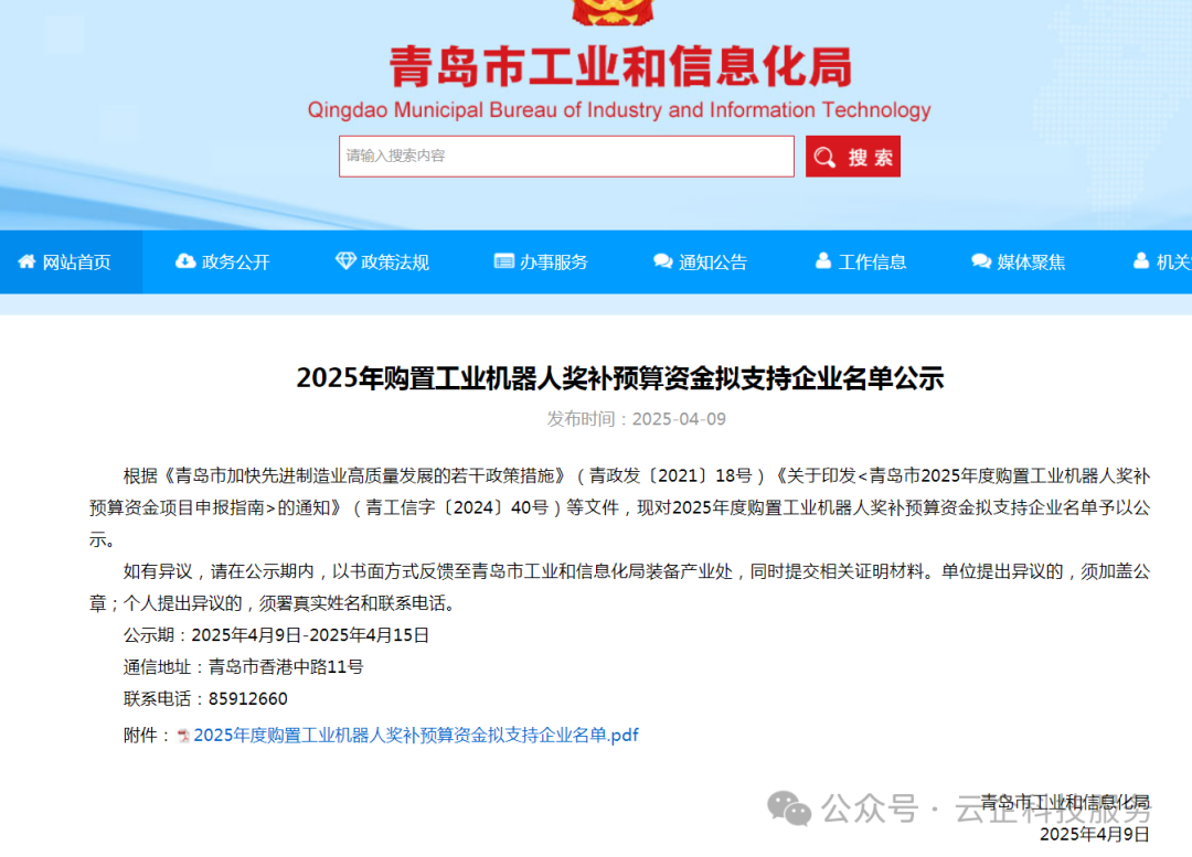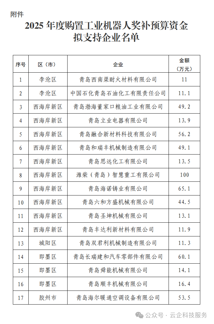 根据《青岛市加快先进制造业高质量发展的若干政策措施》(青政发〔2021〕18号)《关于印发<青岛市2025年度购置工业机器人奖补预算资金项目申报指南>的通知》(青工信字〔2024〕40号)等文件,现对2025年度购置工业机器人奖补预算资金拟支持企业名单予以公示。