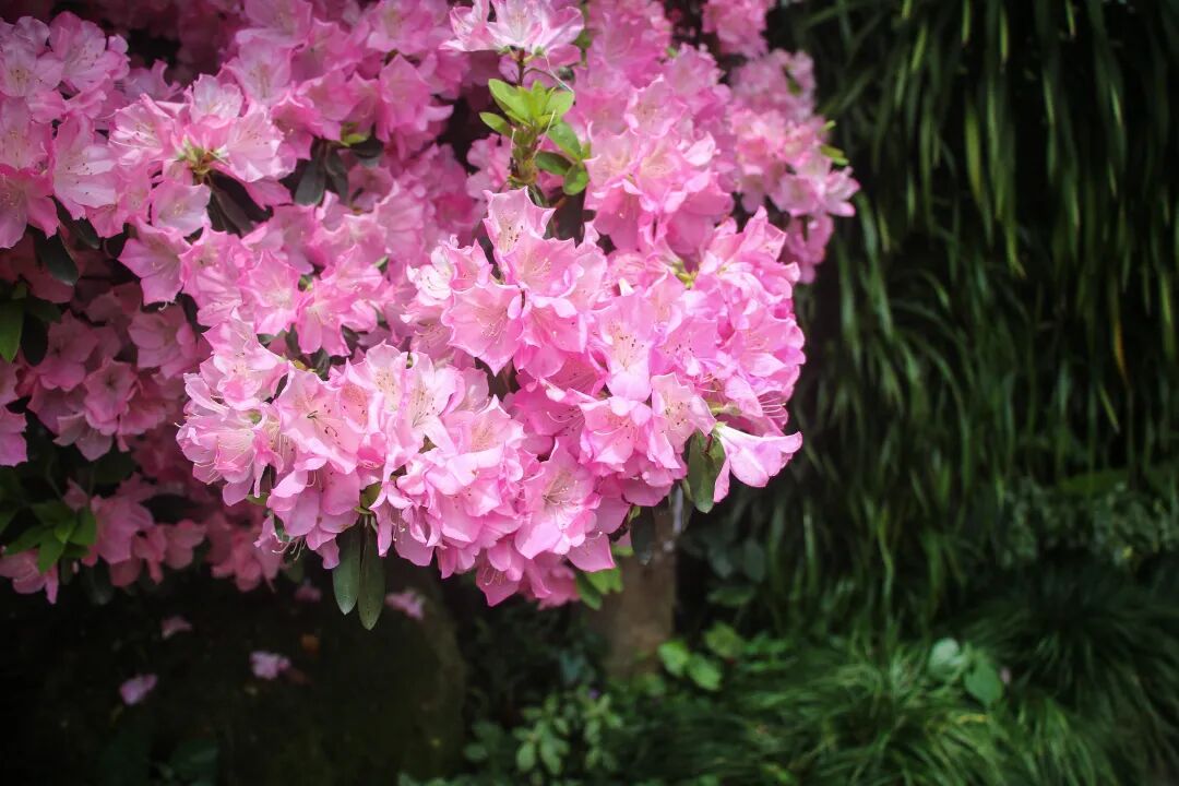一株株大型繁盛的丛生杜鹃,袅袅于红毯的未端腾起,与远山上的龙尊宝塔遥相呼应。回望之若彩云托塔,系一派祥瑞之象,共同勾勒出一幅上下呼应,远近交融的旖旎画卷。