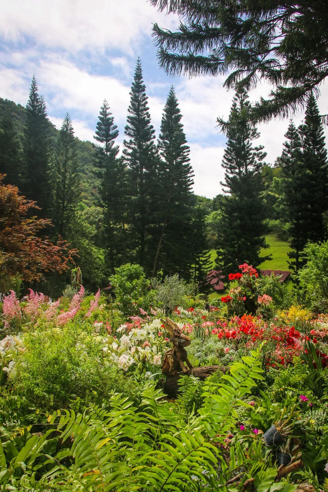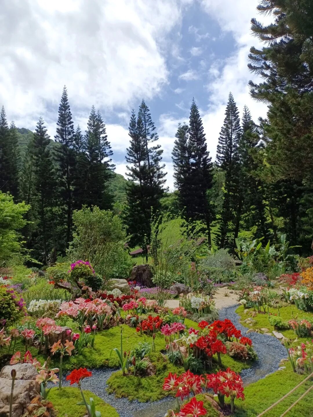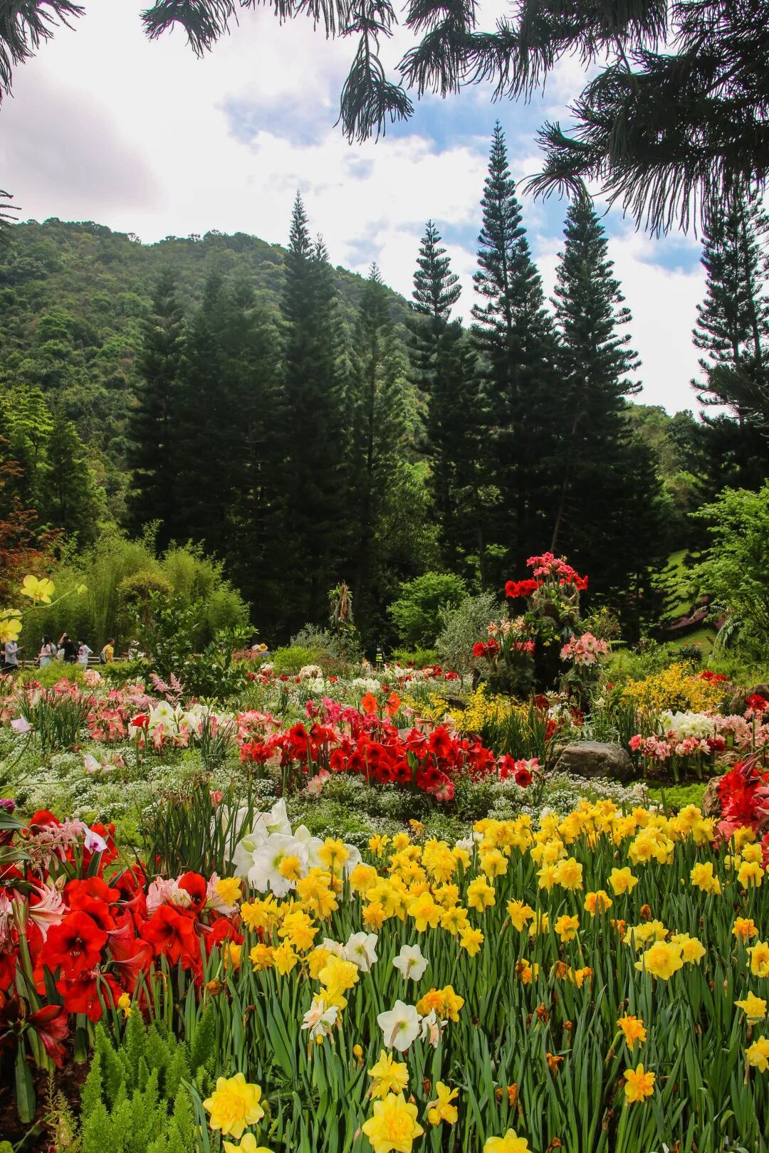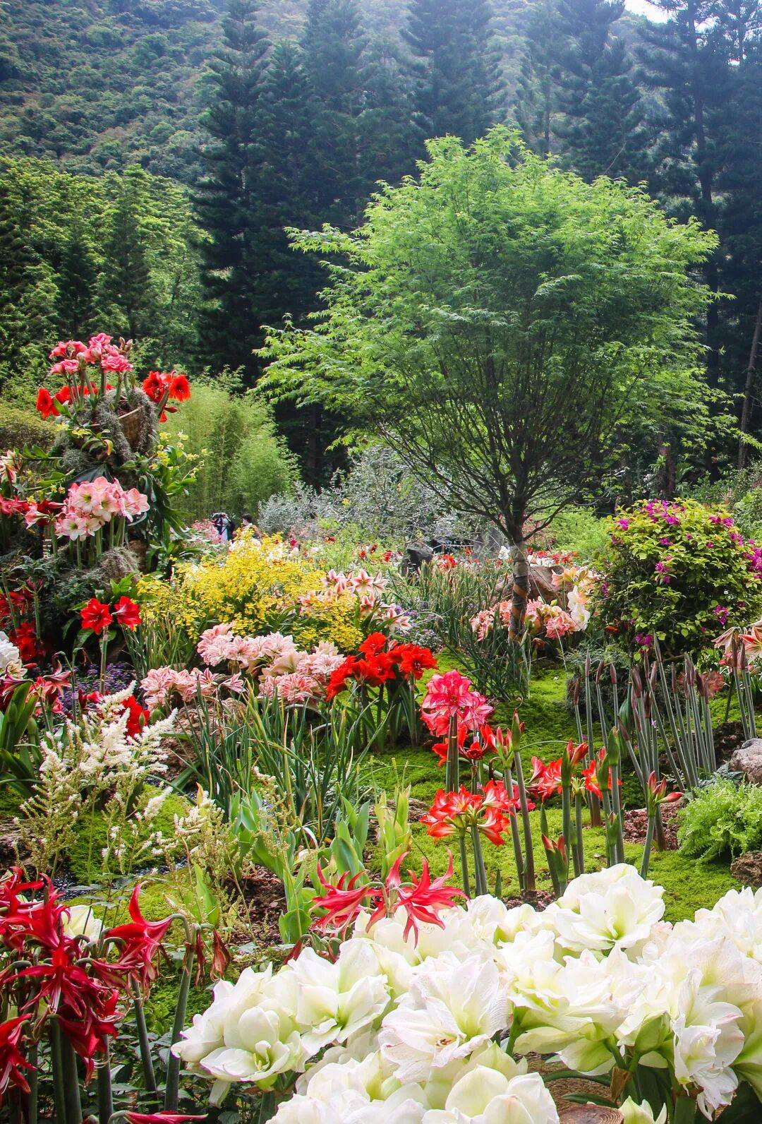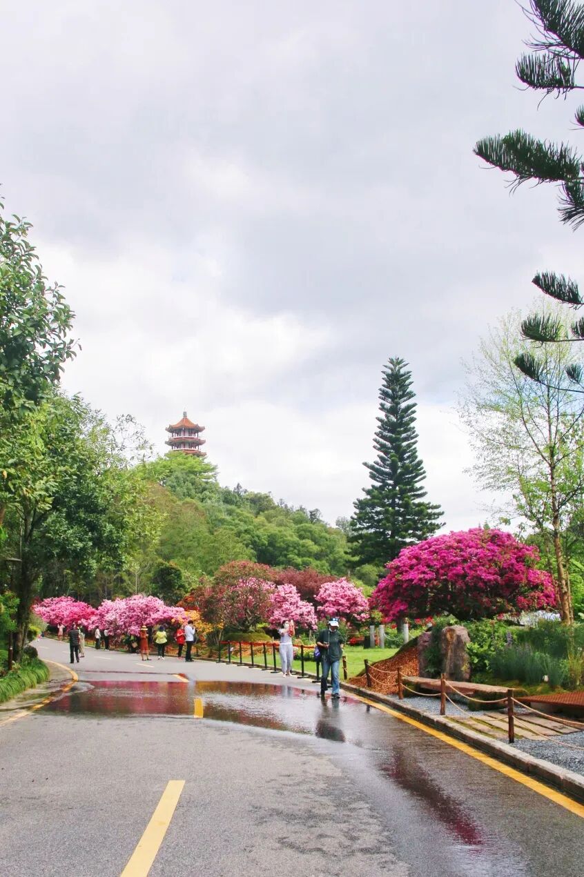 在桫椤湖旁的大草坪开端,色调深浅变化的杜鹃织就一匹云蒸霞蔚的迎宾红毯。陌上花开徐徐行,杜鹃花团锦簇,如乐曲的跳跃节奏,似花海的跌宕起伏。