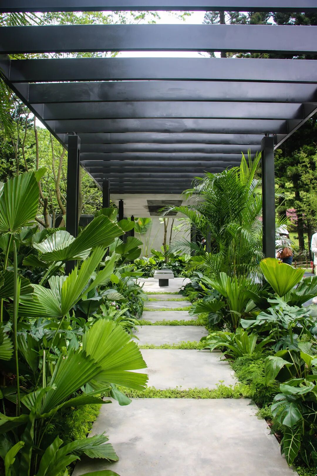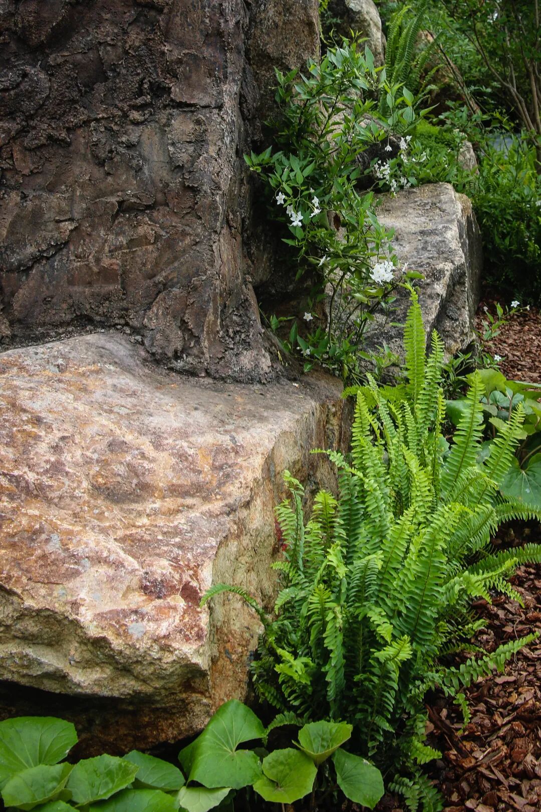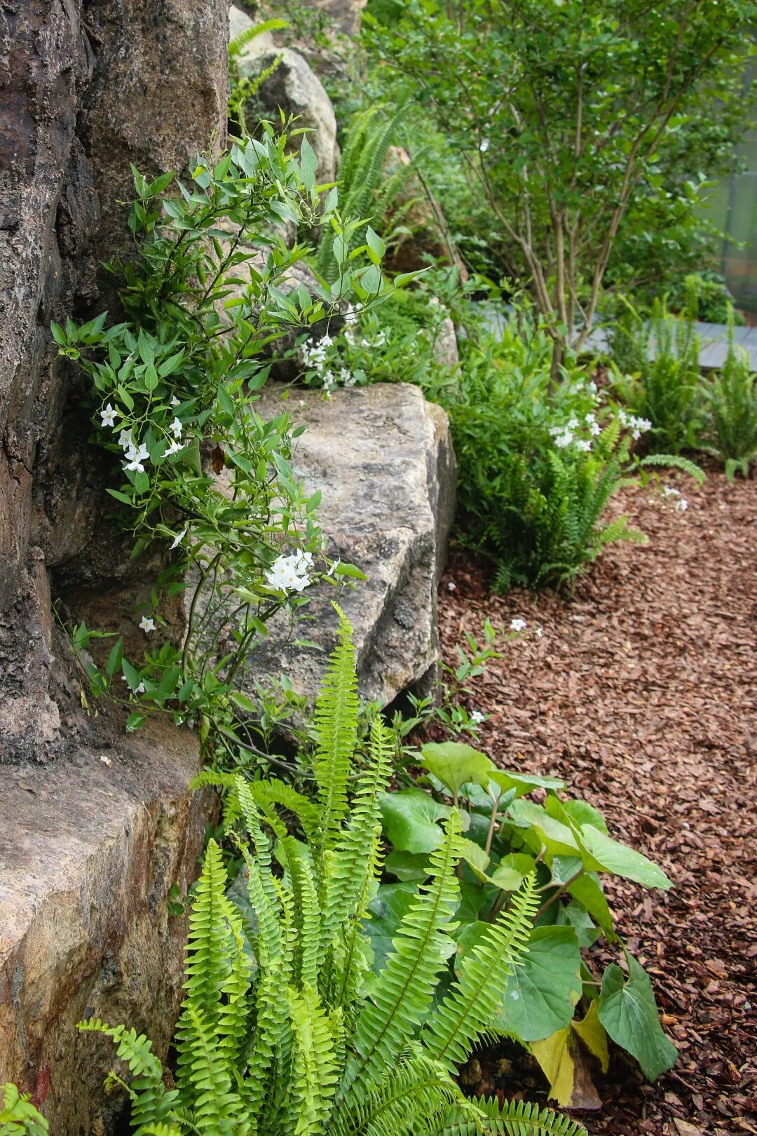 自然原石建造的植物特色岩墙可提供相对私密的环境,并在不同高度创造多样的栖息地,展示自然主义的种植风格植物上方的走道以钢板架设,最大限度地减少对景观的干预。