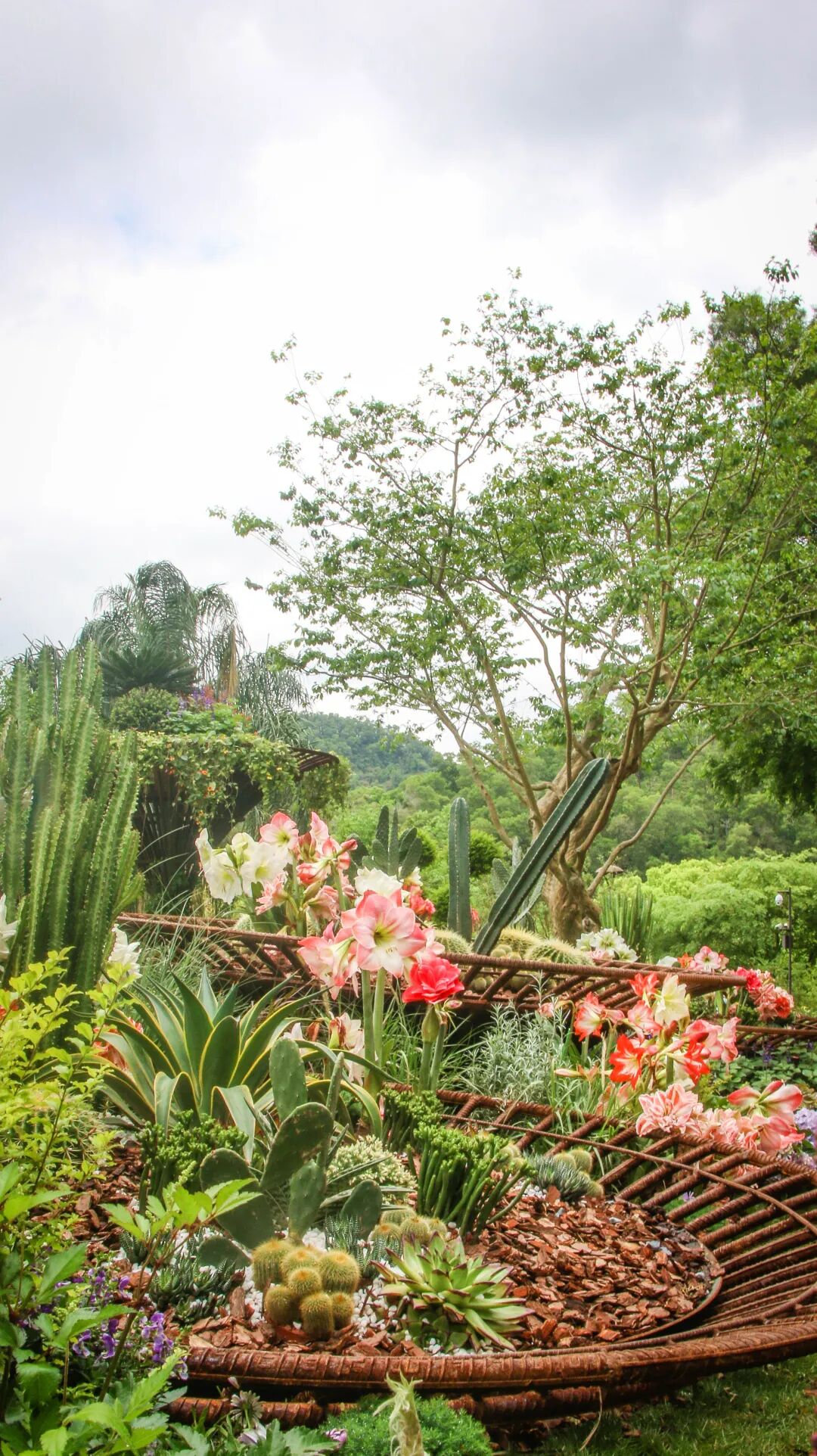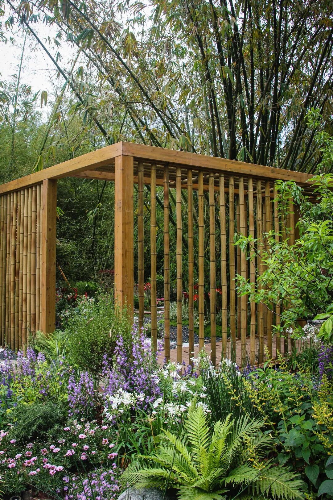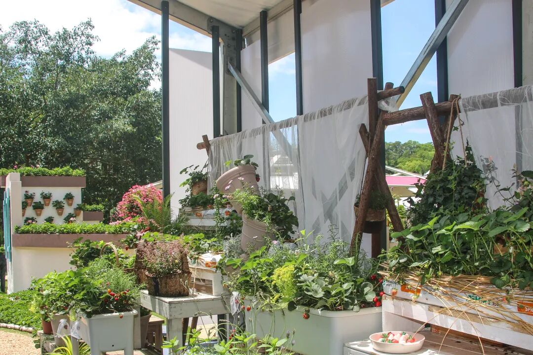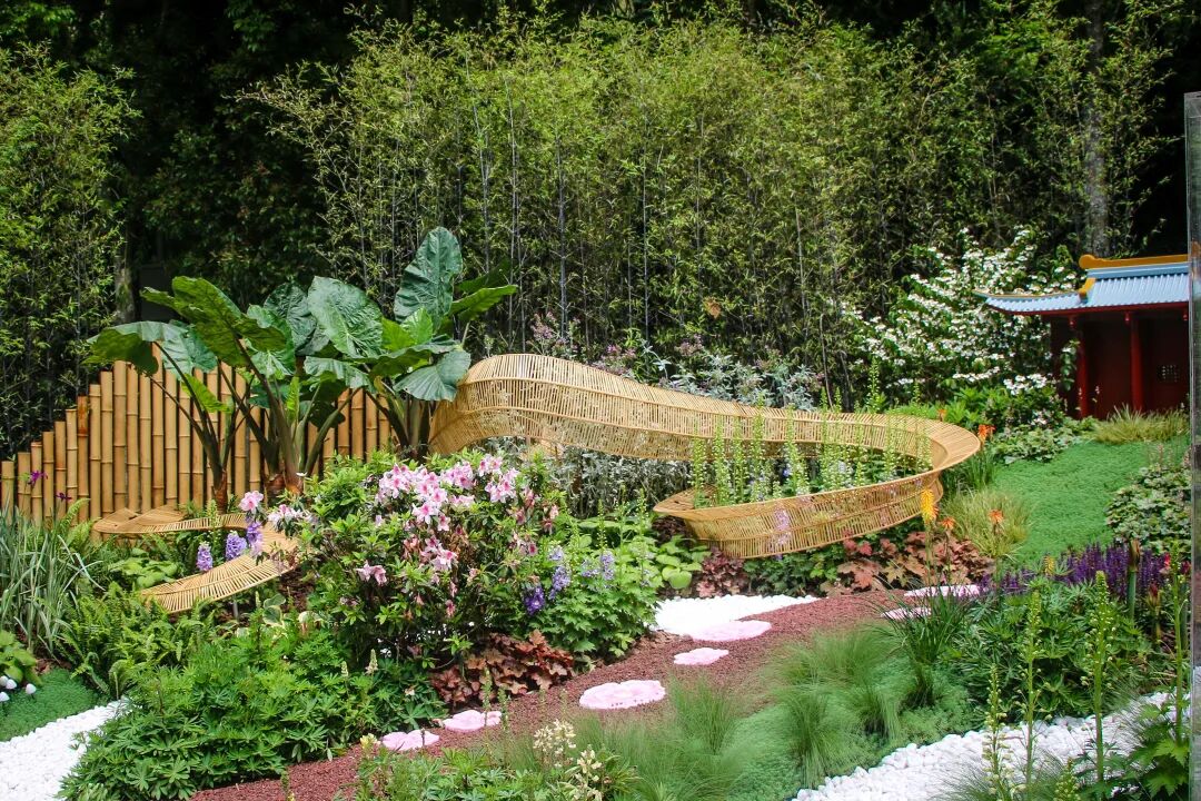 本花园设计灵感来自于涪陵城两江交汇处的壮观景象通过种植不同颜色的绣球冷色--乌江暖色--长江打造绣球创意两江交汇板块。同时,以竹材搭建,垂挂青菜头,展示涪陵榨菜制作特色场景。