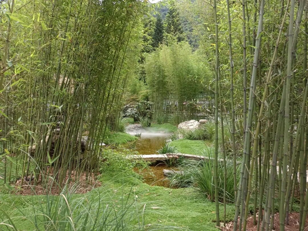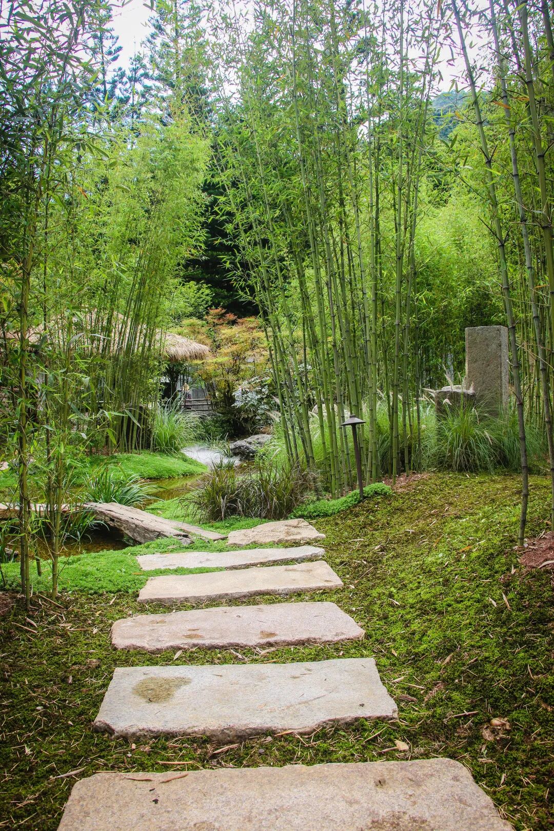 在花园设计中,设计师以自然山野之景来营造出隐士修行之境。曲径、青竹、茅草、山岩,结合现代浅溪小景,以最简单的自然元素营造自然之灵动。