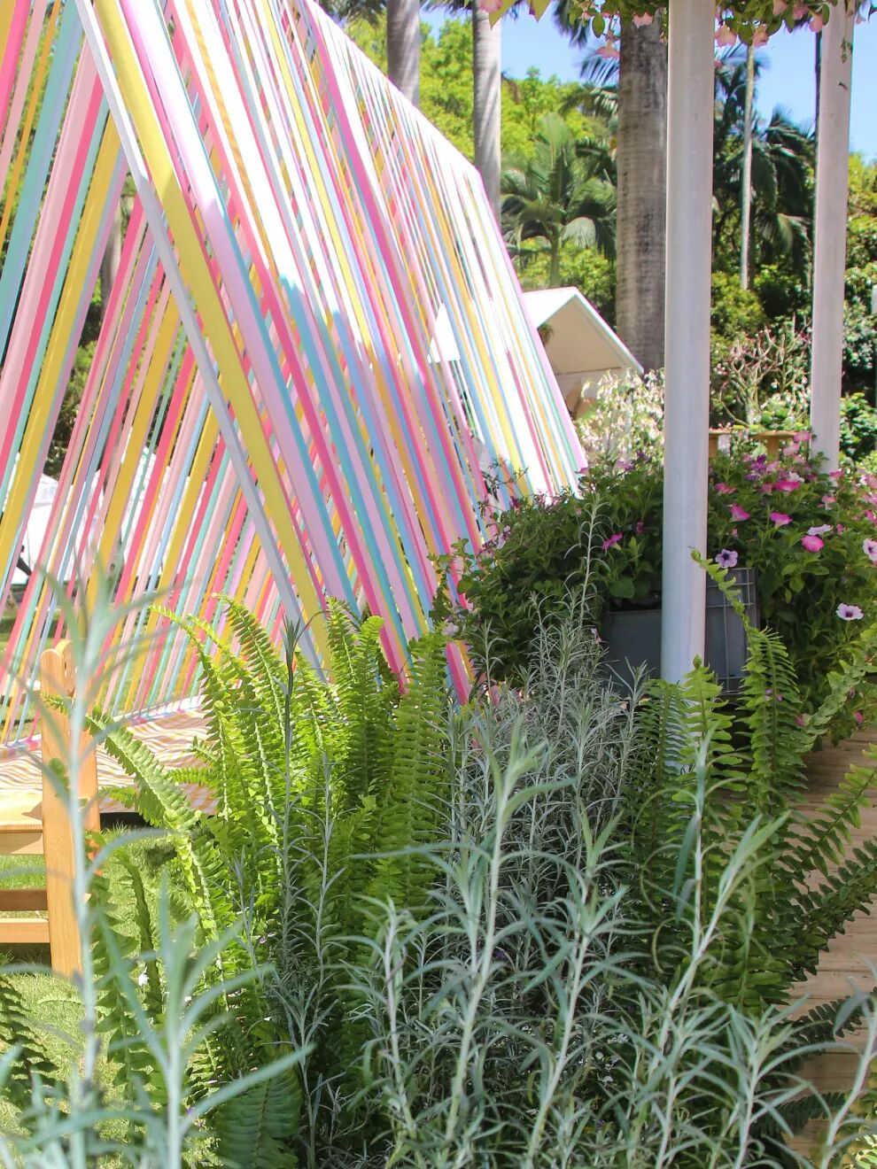 构架贯穿整个场地,形成中心长廊,结合主题花卉朱顶红,搭配“环保月季”为主要植物材料,构架的高度满足藤本月季的自由生长,在粗糙麻绳的衬托下更显花儿娇美。简约的构架衬托色彩缤纷的月季,展现自然之美,以及彰显花境特色及实现低维护、抗性强、可持续开花、环保低碳、可循环利用的长效花境