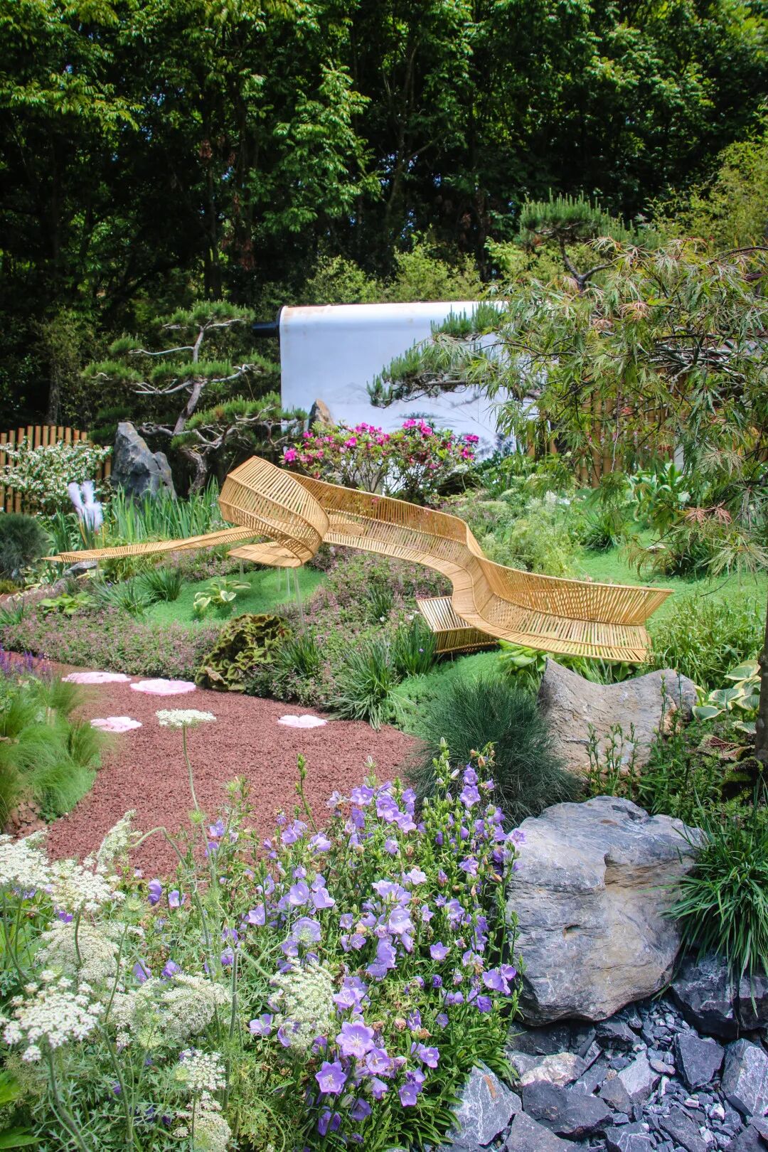 花园构思主要关注城市生态可持续发展国家碳中和规划,采用碎石、枯木藤条以及麻绳等可回收材料和多年生观赏草为主,春夏观叶,秋冬赏色悦絮;风吹草动,动态景观优美,体现花园的自然生态感,花园展出后可二次回收利用或后期以肥料的形式再次回馈自然,打造一个原野生态的低碳花园