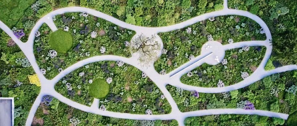 精心设计的角度可让人捕捉到自己的倒影,捕捉到天空和花园的精彩瞬间。一条蜿蜒起伏的小径邀您穿过花园,在雄峰般的拱门和浮云般的植物间移步易景,天然巨石固定着地貌,丰富层次,提供了沉浸式体验,天空则倒映于抛光的金属巨石上。